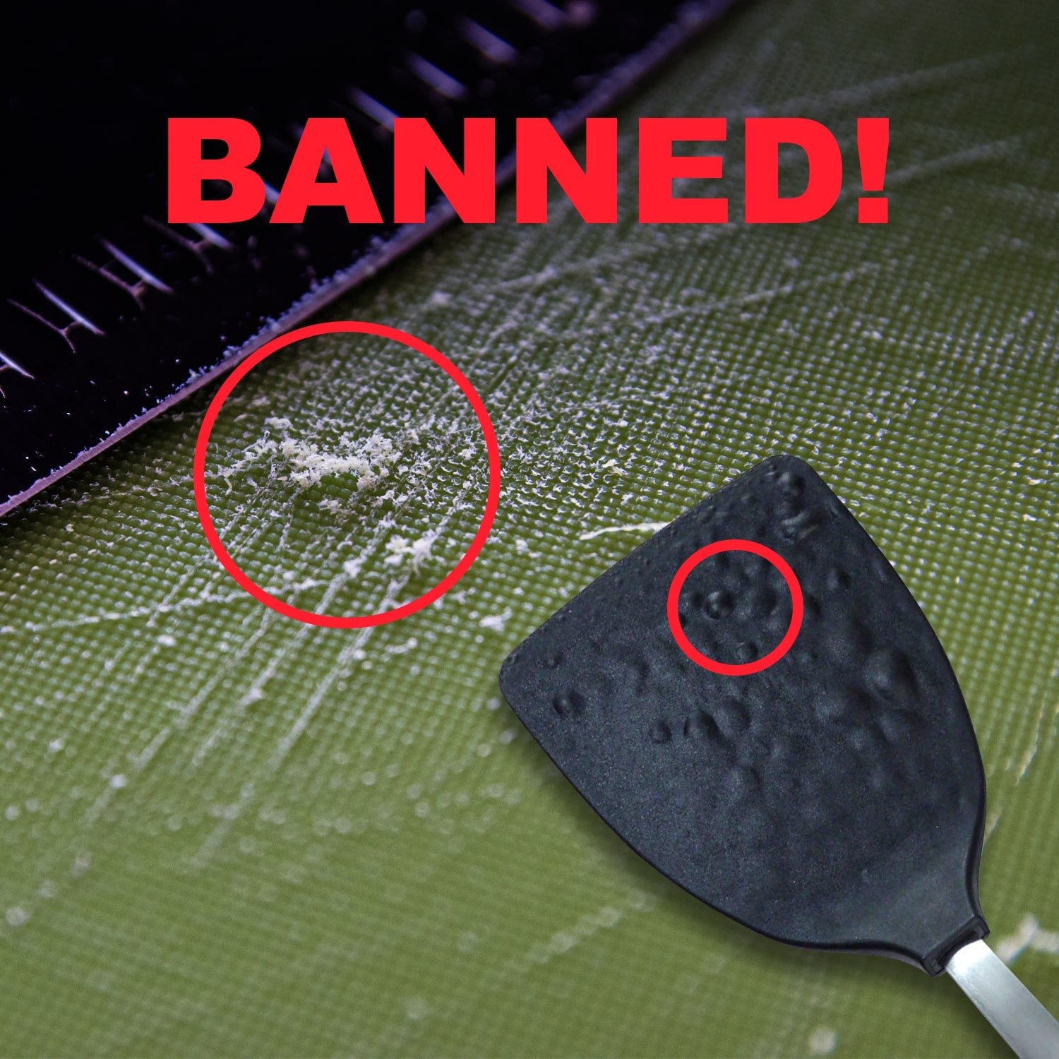 Steel spatulas are very hard and can easily scratch non-stick surfaces. These scratches damage the coating, leading to the release of toxic forever chemicals into your food. This not only reduces the effectiveness of your cookware but also poses serious health risks, such as hormone disruption.